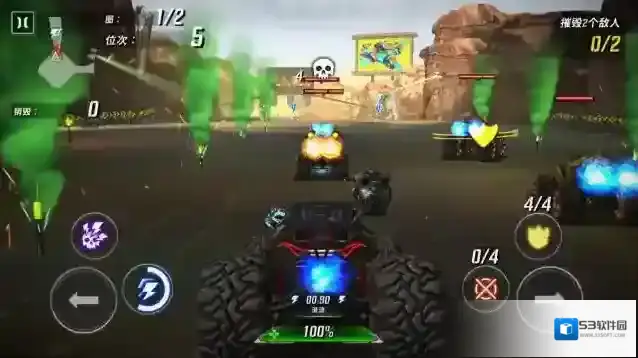 7、进入关卡后左右箭筒控制车辆的转向,蓝色的按钮是冲刺,紫色的按钮是终极技能,红色的瞄准是发射导弹,黄色的盾牌是护盾,这些按钮点击就可以使用。