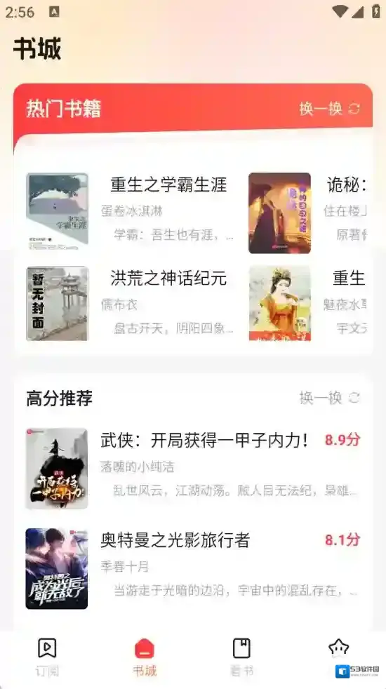 2、“书城”页面,拥有很多的小说资源,包含了言情、科幻以及武侠等类型。
