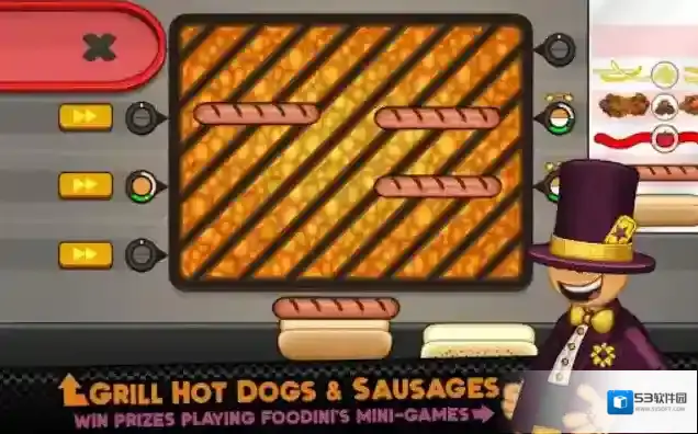 1、记录好客人的需求后,就可以来到第一步煎烤肠,这一步的关键就是翻面时机,待一半的颜色变成橙色后就点击翻面,待另一面变成同样的颜色后就可以拿出来了。