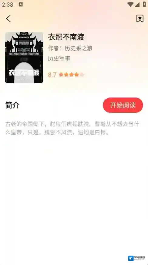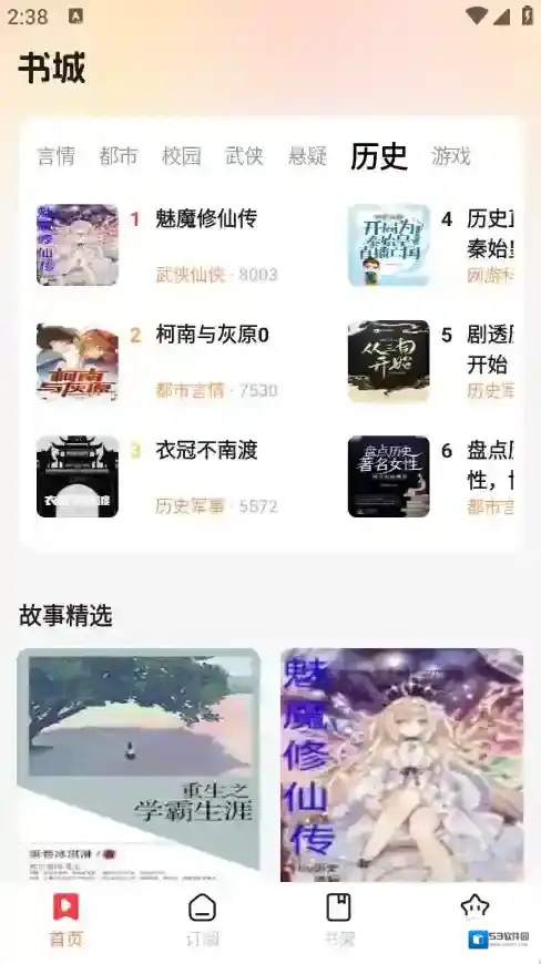 2、首页有很多的小说类型,言情、悬疑以及历史等类型。