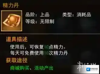 4、精力丹是恢复精力值的重要道具,使用后可恢复角色10点精力值。精力丹的获取来源包括每日累计活动以及完成江湖录任务。