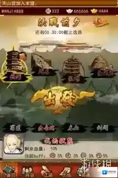 在第一次进行选择时掌门可以选择从以下四处任意一处出发,每处可为掌门增加不同属性,并且选择不同道路的掌门之间不会互相遭遇。