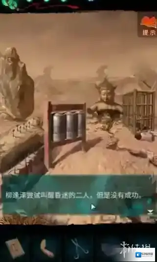 3、进入小门后,玩家可以看到众多的佛像。接着,玩家的目光被左侧躺着的佛像尖刺机关所吸引。这个机关设计精巧,在成功调整机关后,玩家可以获取珠子以及雕像断臂等重要物品。