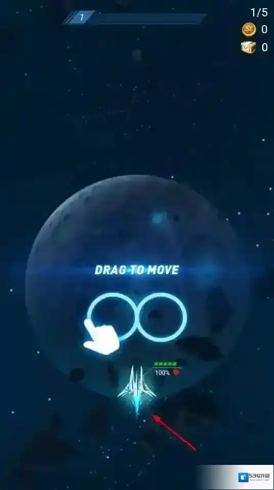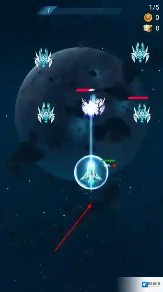 1、进入游戏后,在战机选择界面挑选心仪战机,滑动屏幕操控战机在初始太空场景中移动,点击射击按钮对迎面而来的敌人发动攻击。