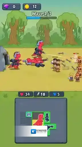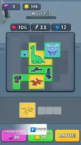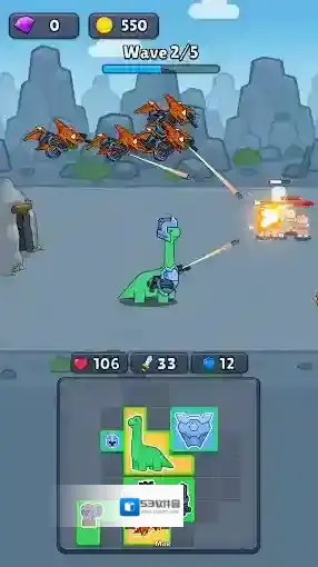 1、在网格上排列你的恐龙和武器,将它们正确排列,并聚集你不可阻挡的恐龙军队,还能装备上武器,去消灭出现的敌人。